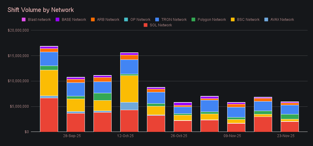 Alternate networks remained locked in the six-week downswing that began in September, with this week’s totals continuing that same trajectory. The Solana network led with $2.07m (−31.3%), continuing its steady pullback from the $3m–$4m zone seen earlier this quarter. The Tron network followed at $1.85m (−3.0%), holding above the $1.5m mark but still trailing the stronger prints from October. Polygon came in at $965k (−30.2%), while BSC logged $413k (−11.6%), both extending their multi-week drift lower. Arbitrum recorded $399k (+20.7%), a small bounce that kept it within its usual range, and Base contributed $196.9k (+27.7%), an oscillating mid-band result consistent with its typical week-to-week movement.