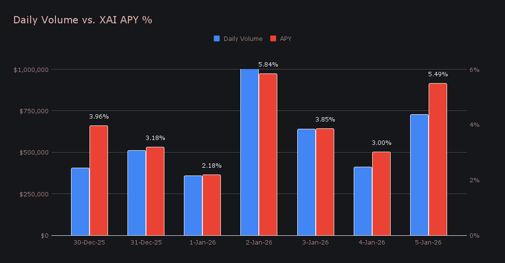 - Stakers earned 103,368 XAI ($11.4k) at a 3.93% average APY, with January 2 marking the most active day.