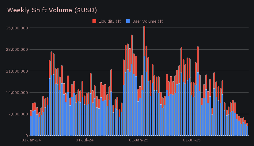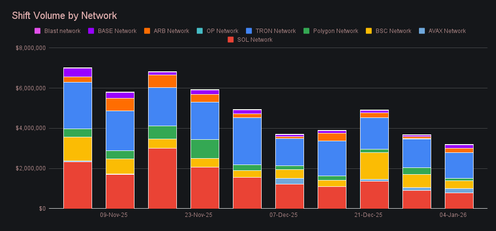 SideShift began the year with $4.07m in gross weekly volume, a −19.4% move from the previous reporting window. With the measurement period landing squarely around New Year’s, overall participation was lighter, and user shift volume came in at $3.15m (−16.6%). The softer flow on the user side fed through to liquidity shifting, with liquidity shifting declining to $920k (−27.5%) as fewer large or directional shifts required internal rebalancing. Across the week, this translated to an average of $581k in daily volume alongside 754 shifts per day, setting a low but clean baseline as the year gets underway.