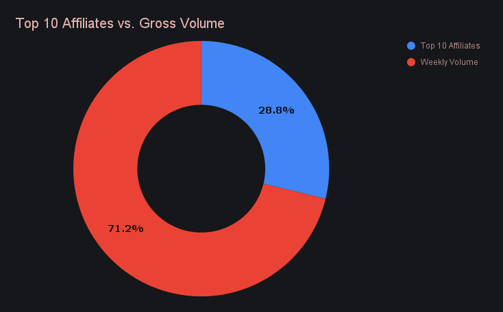- Affiliate volume rose to $1.17m (+18.7%), accounting for 28.8% of total weekly volume.