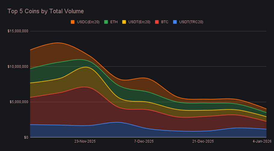 ETH finished fourth with $580k in total volume (−29.5%) for the week. Deposits fell to $289k (−39.4%), while settlements came in at $290k (+5.9%), leaving activity nearly evenly split between the two sides. That profile closely mirrored SOL, which ranked just below in sixth at $507k (−25.2%), following a similar step-down after stronger activity earlier in December. Both assets saw participation cool at the start of the year, but maintained enough baseline usage to remain clustered just outside the stablecoin-heavy top tier.