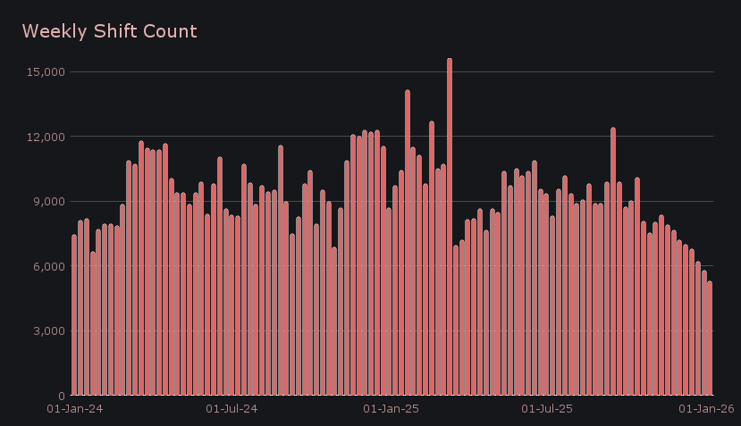Shift count totaled 5,275 transactions (−8.6%), with activity dipping to 540 shifts on January 1st before rebuilding through the remainder of the week and closing at 906 shifts on January 5th. Larger shifts remained relatively scarce during the period, continuing a trend seen through late December, while overall participation recovered more quickly. Taken together, the count data suggests engagement returned promptly after the holiday pause, even as activity remained skewed toward smaller, routine usage.