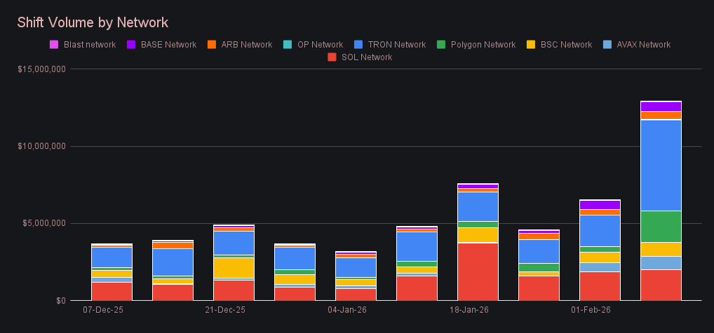 SideShift delivered its strongest performance in over eight months as extreme market swings translated into decisive on-platform volume. Gross weekly volume climbed to $22.86m, an +89.3% jump from last week and the highest weekly total since mid-July 2025. Volume was not confined to a single session either — February 6th alone recorded $6.6m, matching that same eight-month high on a daily basis. User shifting rose sharply to $14.29m (+71.3%), driven primarily by heavy BTC buying, which in turn pushed liquidity shifting to $8.57m (+129.5%) as SideShift absorbed the resulting imbalance. Stablecoin-to-BTC pairs sat at the center of this push, led by USDT (TRC-20)/BTC at $2.03m, followed by BTC/USDC (ERC-20) and USDC (ERC-20)/BTC, underscoring how directly this week’s volatility translated into BTC-focused repositioning.