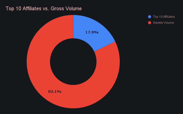 Affiliate volume jumped sharply this week, combining for $4.02m (+184.9%) and materially outpacing last week’s totals. Among top partners, first place generated $553.7k (+12.2%), while second place added $289.4k (+23.6%). Third place recorded the strongest relative move of the group, rising to $235.1k (+317.8%) after a far smaller contribution last week. Overall affiliate volume extended well beyond the contribution of the top partners alone, pointing to a notable increase in referral driven activity.In total, top affiliates accounted for 17.9% of SideShift volume, up from 12.3% in the prior report.