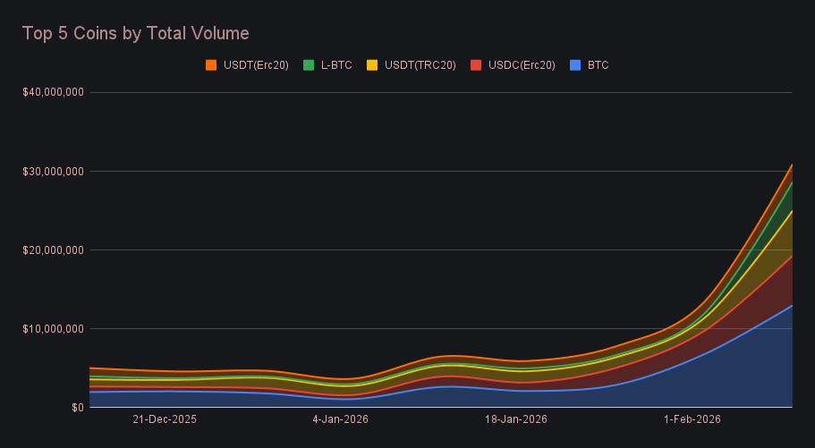 BTC sat comfortably at the top of the table, generating $12.97m in total volume (+90.5%), more than doubling its footprint from last week. User deposits climbed to $3.78m (+70.6%), while settlements steeply rose to $4.60m (+125.9%), reflecting heavy two-way repositioning during the sharp market swings. The scale of BTC shifting also stood out on a longer view, marking its strongest showing since last spring, when it was in price discovery. That dominance extended beyond spot BTC alone, with L-BTC adding $3.65m (+543%) and WBTC (Polygon) contributing a further $1.66m (+868%), bringing Bitcoin-linked assets to roughly 40% of total weekly volume.