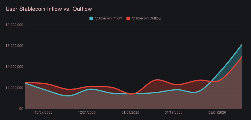 Stablecoins again accounted for a large share of weekly volume and completed the top five, with activity firmly tilted toward selling into volatility. USDC (ERC-20) ranked second overall at $6.32m (+113.6%), driven primarily by user settlements, which climbed to $2.01m (+659.8%), while deposits slipped marginally to $1.26m (−3.6%). USDT across Tron and Ethereum followed with a combined $7.96m in total volume, led by USDT (TRC-20), where deposits surged to $2.46m (+240.9%), signalling aggressive BTC accumulation via Tron rails, while USDT (ERC-20) contributed $2.26m (+49.9%) with a more balanced split between deposits and settlements. These patterns were reflected in net user stablecoin flows, which remained positive for a second straight week and registered a + $1.15m net inflow, one of the strongest readings on record and a clear indication that capital continued to lean into risk during the sell-off.
