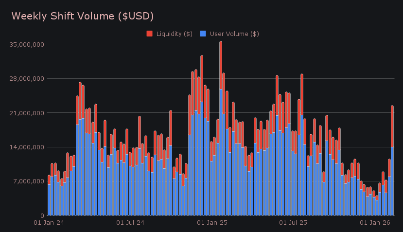 Shift count rose to 10,570 (+21.9%), marking the first time totals have cleared the 10k level in roughly five months. While participation picked up meaningfully, it grew at less than a quarter of the pace of weekly volume, reinforcing that this was not a week defined by sheer transaction frequency. Even with shifts returning to upper-range levels, it was the size of individual shifts, not a surge in smaller ones, that powered SideShift’s strongest showing in several months.