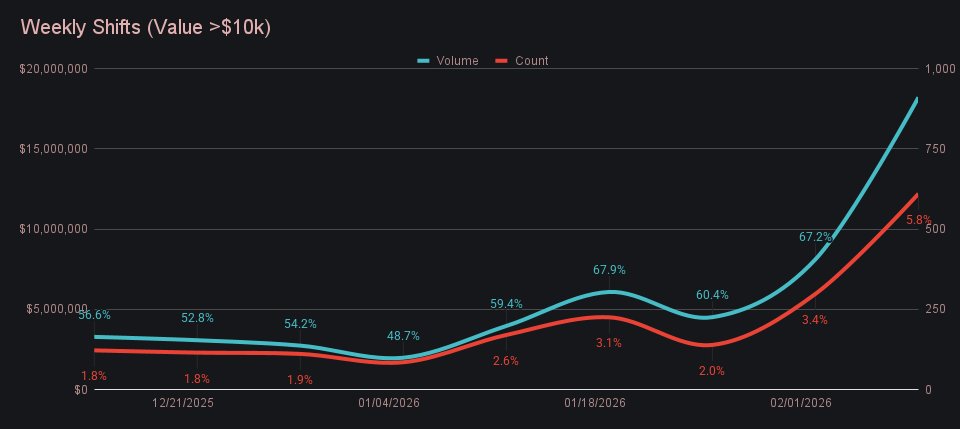 Whale activity returned in force this week and did most of the heavy lifting. Shifts valued above $10k made up nearly 80% of total volume, a sizable jump from early January, when the share of high-value shifts briefly slipped below the 50% mark. Even more telling, shifts over $20k alone accounted for roughly 66% of weekly volume, reinforcing just how concentrated activity became at the upper end, with the vast majority of this trading taking place directly on the site. The result was a clear case of scale overpowering frequency, with a relatively small number of large shifts (610) exerting an outsized influence on total volume.